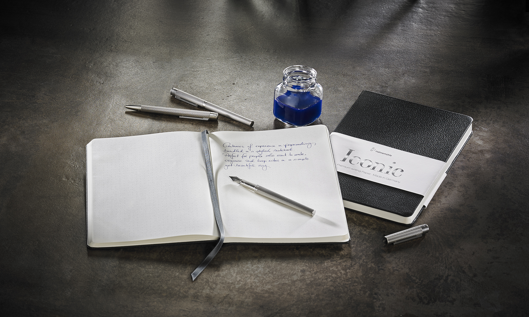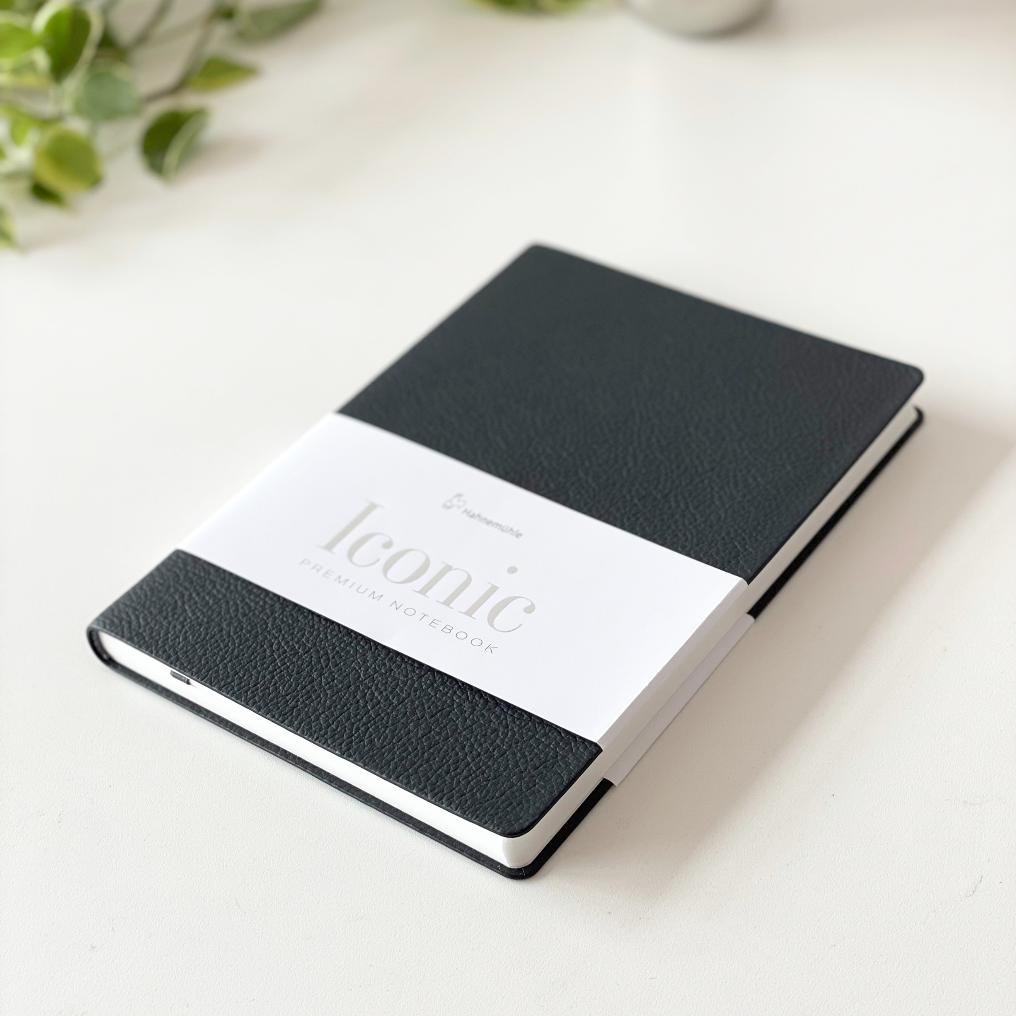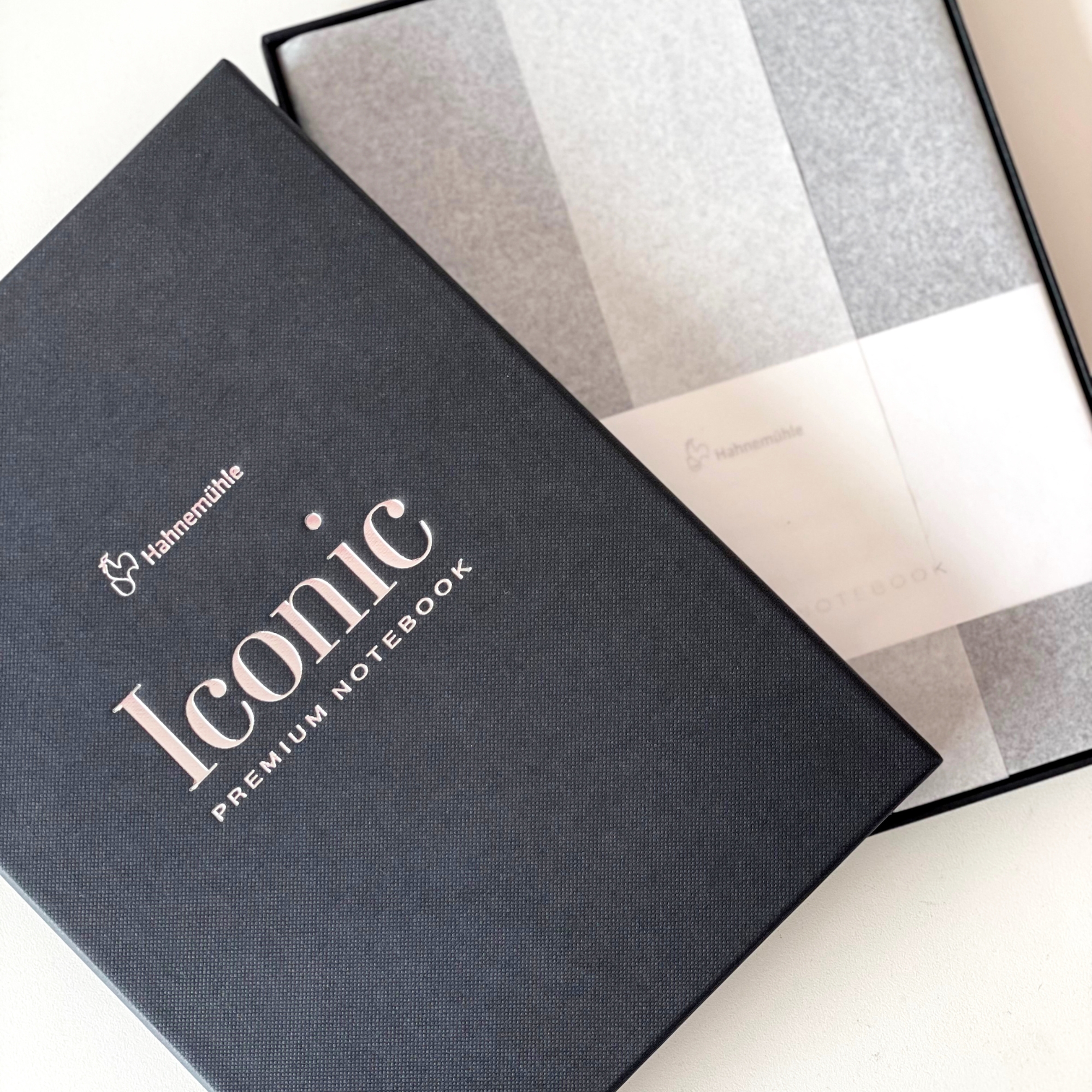 For all those who love luxury even when writing: the Iconic Notebook from Hahnemühle. In a soft genuine leather cover, the finest creamy natural white 100 gsm paper with watermarks invites you to record all your daily thoughts on 192 pages. This notebook can be personalised with a name. Make it personal - for yourself or as a valuable gift! The acid-free, subtly dotted paper in the Iconic Notebook lies wonderfully flat when you open the notebook 180°. Fountain pens or other pens glide effortlessly over the paper. This notebook is an invitation!