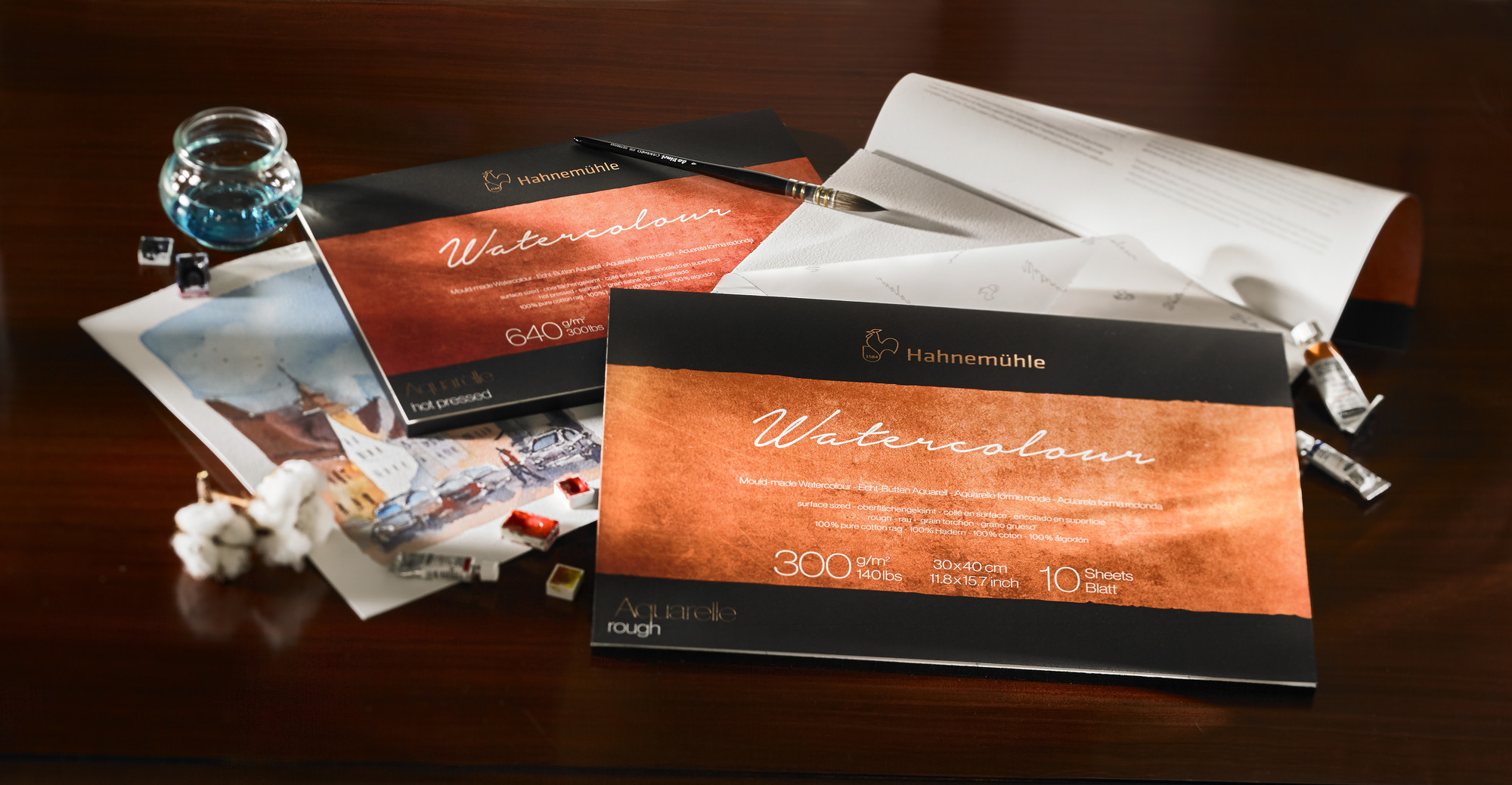 Hahnemühle Watercolour 300 and 640 set new standards for high-quality watercolour papers. A carefully chosen variety of cotton offers extremely strong fibres and incomparable purity. The selection of the best raw materials and exclusively natural filler materials gives the Watercolour 300 and Watercolour 640 papers their unparalleled quality.The prized cotton papers, Watercolour 300 and 640, are characterised by a very durable paper surface that is well suited for demanding watercolour techniques.The fibres do not lift, rub off or loosen, even when applying multiple layers of colour, or when using masking fluids and tapes. This paper lets you use the most beautiful colours and create remarkable wet-on-wet paintings.