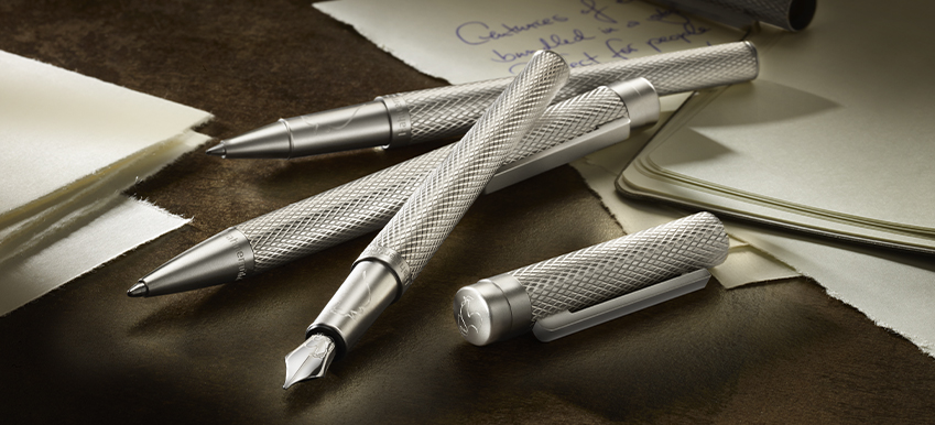 We know all there is to know about editions at Hahnemühle. After all, artists and creative minds have been using our limited-edition paper since we were established in 1584. Our 'First Edition' writing instruments are veritable treasures for anyone who loves writing and collecting sophisticated accessories. The collection consists of fountain pens, rollerballs and ballpoint pens – and there are only 100 of each available worldwide! All our writing instruments are coated with a palladium alloy and decorated with a striking guilloché pattern. The fountain pen’s shaft, cap and nib are also adorned with delicate engraving. Our rhodium-plated 18-carat gold nib, with a stroke width F, M or B adds the finishing touch to this special edition fountain pen.