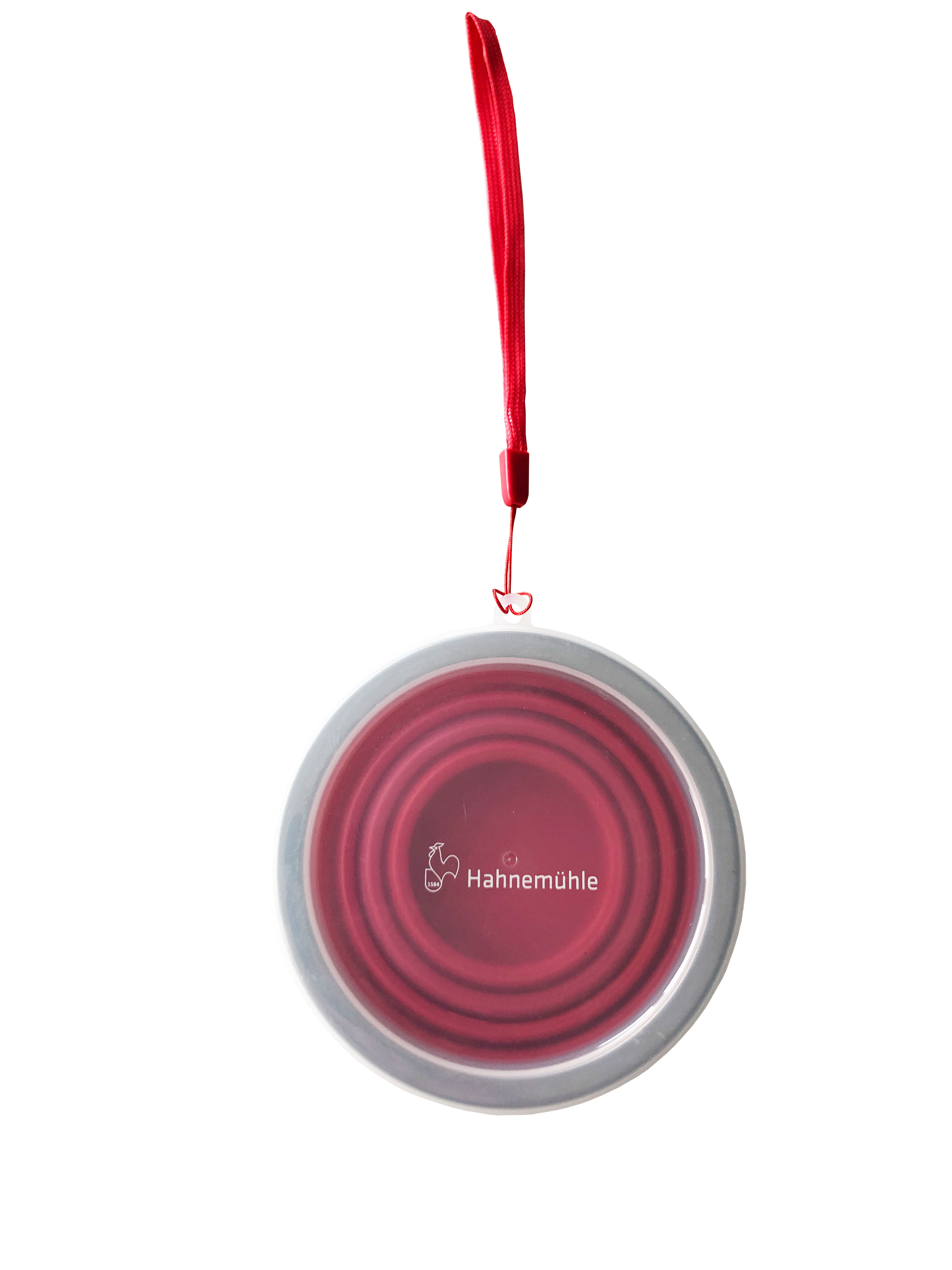 An ingenious portable painting cup which folds down into a compact travel size. Easily attaches to pencil case or bag with the hook provided. Made of red silicone, with lid and Hahnemühle logo.