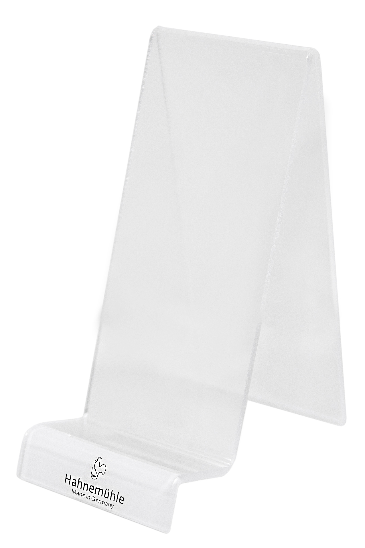 Present our notebooks optimally with the Hahnemühle bookstands at your point of sale or on shelf. They are made of acrylic and convince with their stability and size. The stand measures 80 X 137 X 180mm.