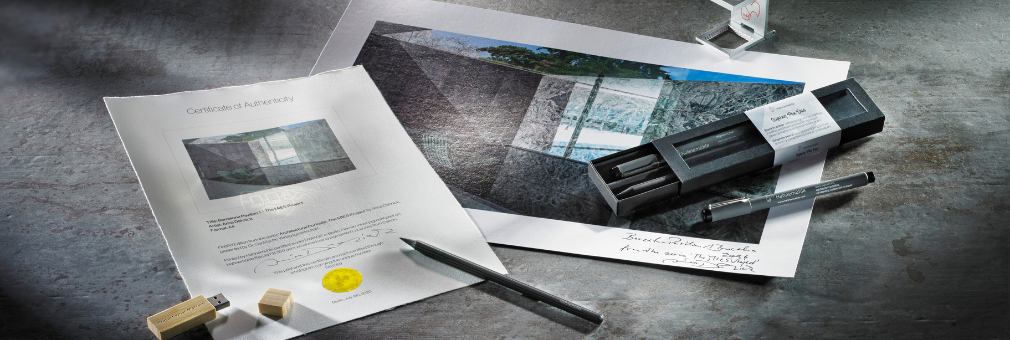 Il est essentiel pour les artistes de protéger leurs œuvres - non seulement physiquement, mais aussi en termes de droit d'auteur. Hahnemühle propose des accessoires et des services utiles : pour certifier l'authenticité des œuvres, pour présenter les images ou pour protéger les tirages des influences extérieures sans altérer le papier.