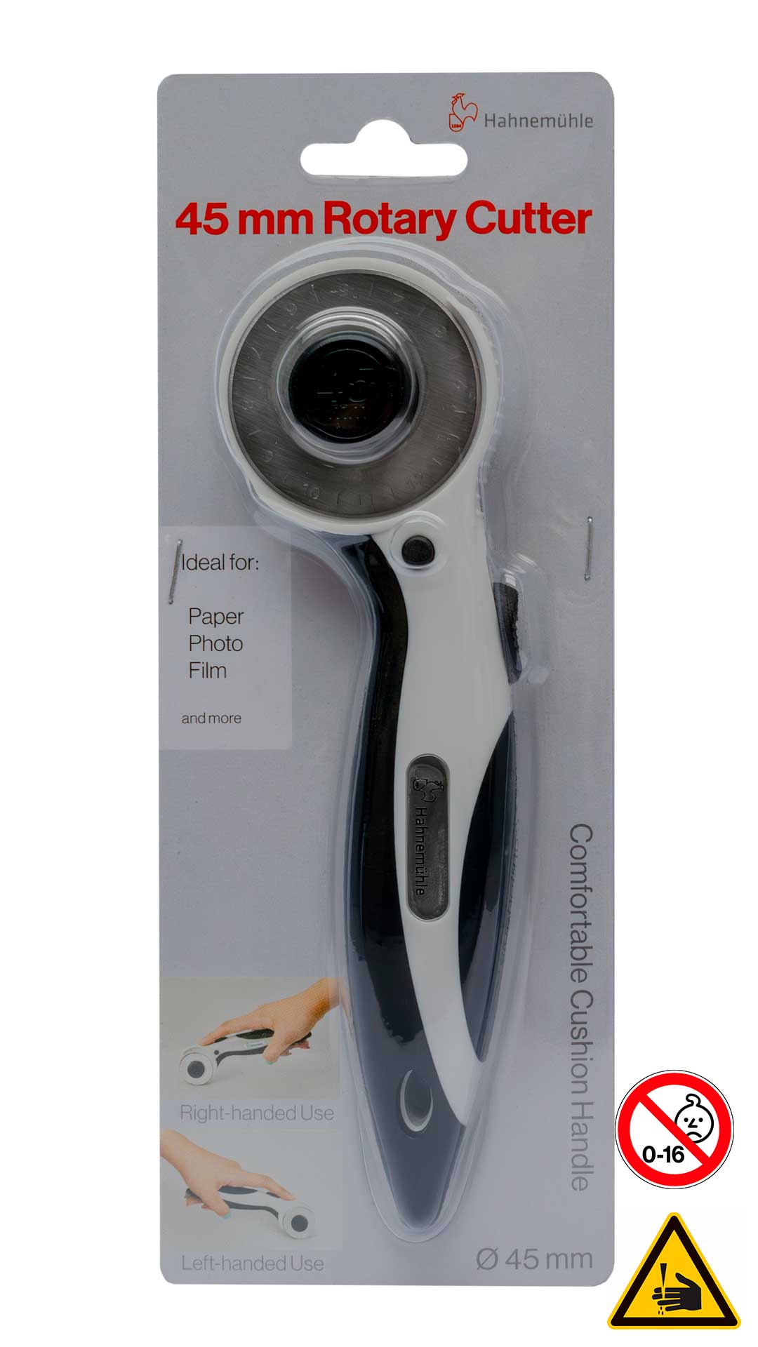 Der ergonomische Rollschneider von Hahnemühle wurde für präzises Schneiden von Papier, Fotos, Film und mehr entwickelt. Dank der austauschbaren Klingen kann der Schneider sowohl von Rechts- als auch von Linkshändern verwendet werden. Die 45 mm Klinge besteht aus hochwertigem und robustem SKS-7 Stahl, was für langanhaltende Schärfe und Haltbarkeit sorgt.Für ein Maximum an Sicherheit und Komfort ist der Rollschneider mit einem rutschfesten Griff, verschiedenen Sicherheitsmechanismen und einem praktischen Sperrknopf ausgestattet. Ob feine Details oder große Projekte umgesetzt werden – dieser Schneider bietet die Kontrolle und Präzision, die Sie brauchen.